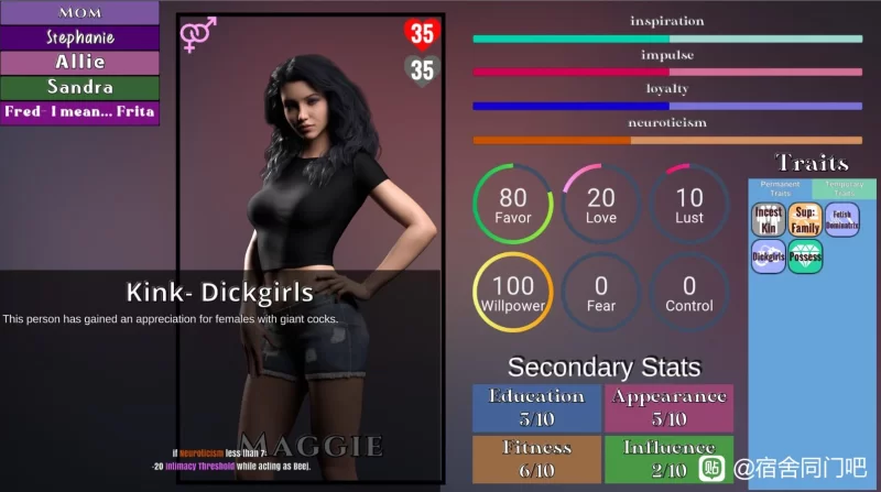 p2和loser中每个人物都有多个腐化阶段。每个腐化阶段人物的行为还有妆造已经互动选项都是完全不同的。人物的技能和互动选项都很丰富,不像有些沙盒剧情推进的和互动小说一样,这个纯粹是通过你自己规划行动来改变思维、推进进度与触发事件。