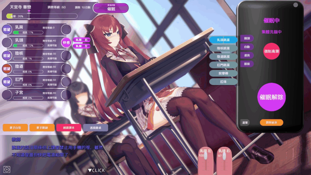 每次调教先选场景、再选洗脑模式,场景共有四种,无人的走廊、医务室、上课的教室,还有一种是集体洗脑后的教室,换言之可以在走廊享受开放式的快感,也可以在医务室病床Play,或是进入「连老师都习惯H」的世界。