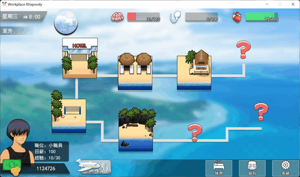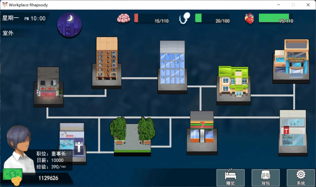 这是一款职场恋爱游戏,玩家还需要通过工作和休息平衡自身的属性