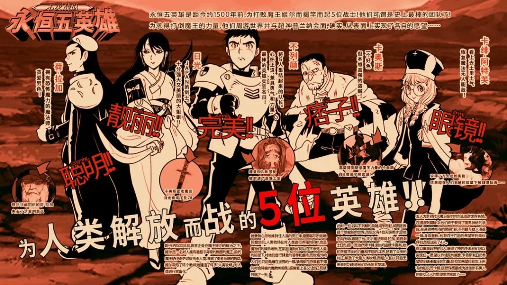 在这千年之中,出现了一批又一批试图讨伐魔王的冒险者,其中最传奇的就是在GL0533年出现被后世称为“永恒五英雄”的五位战士。