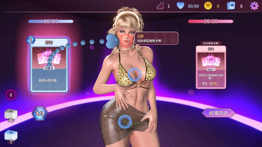 玩家在随机生成的地图中,构筑卡组,并使用卡牌与女孩进行对战,使用不同的卡牌选择女孩的不同部位造成伤害。