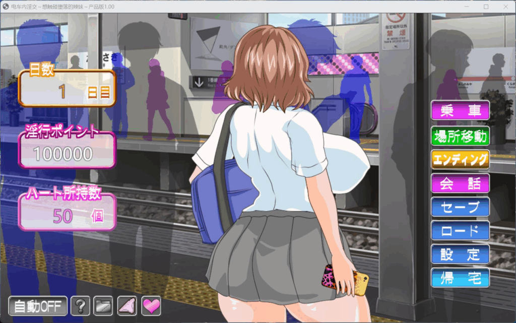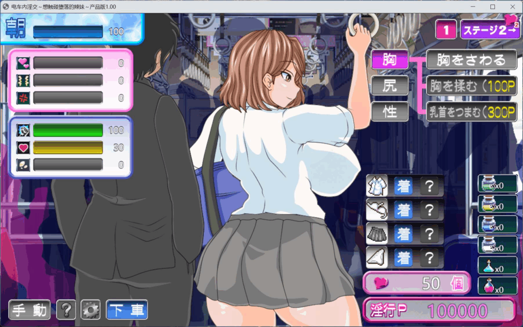 在电车内对辣妹进行H骚扰行为可以积累点数,从而解锁更升级的行为。当快感值达到最大时,辣妹会达到高潮,你便能获得她的心。